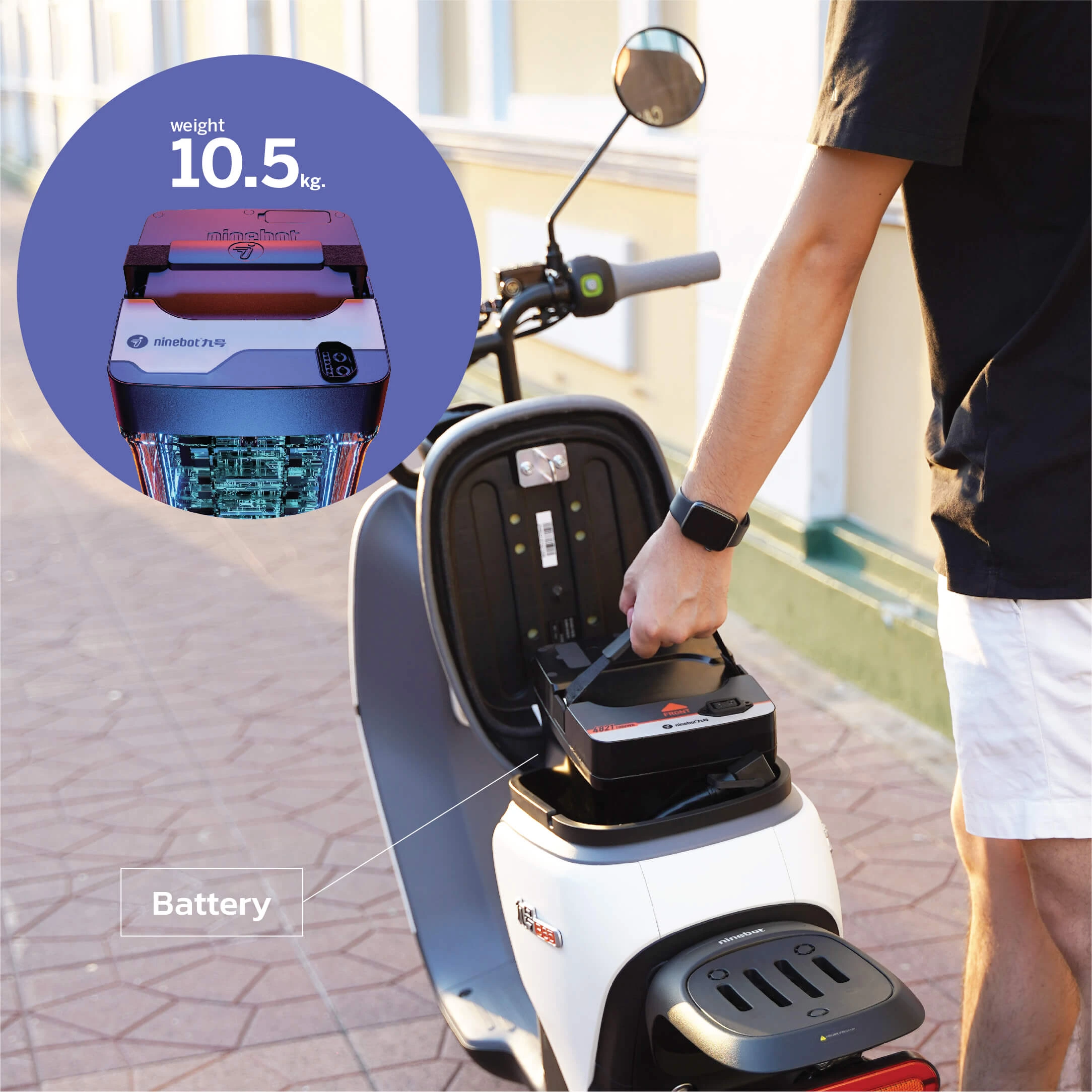 แบตเตอรี่ของ Ninebot eMoped B65 สามารถถอดได้เพื่อนำไปชาร์จแยกโดยพกแบตเตอรี่ไปชาร์จในบ้านหรือคอนโดได้อย่างง่ายดาย ตัวแบตเตอรี่ผลิตจาก Amperex Technology Limited ผู้นำด้านการผลิตลิเธียมไอออนแบตเตอรี่ระดับโลก มาพร้อมระบบป้องกันไฟฟ้าลัดวงจร ช่วยตรวจจับแบตร้อน Battery Management System เวอร์ชั่น 6.0 ตัวแบตเตอรี่กันน้ำระดับ IPX7 ทำให้มีความปลอดภัยมากกว่าแบตเตอรี่รุ่นไหนๆ สำหรับแบตลิเธียมจะช่วยประหยัดระยะเวลาในการชาร์จ เพิ่มประสิทธิภาพของแบตเตอรี่มากกว่าเดิม ลดค่าใช้จ่ายในการบำรุงรักษา และช่วยยืดอายุการใช้งานแบตเตอรี่ให้ยาวนาน