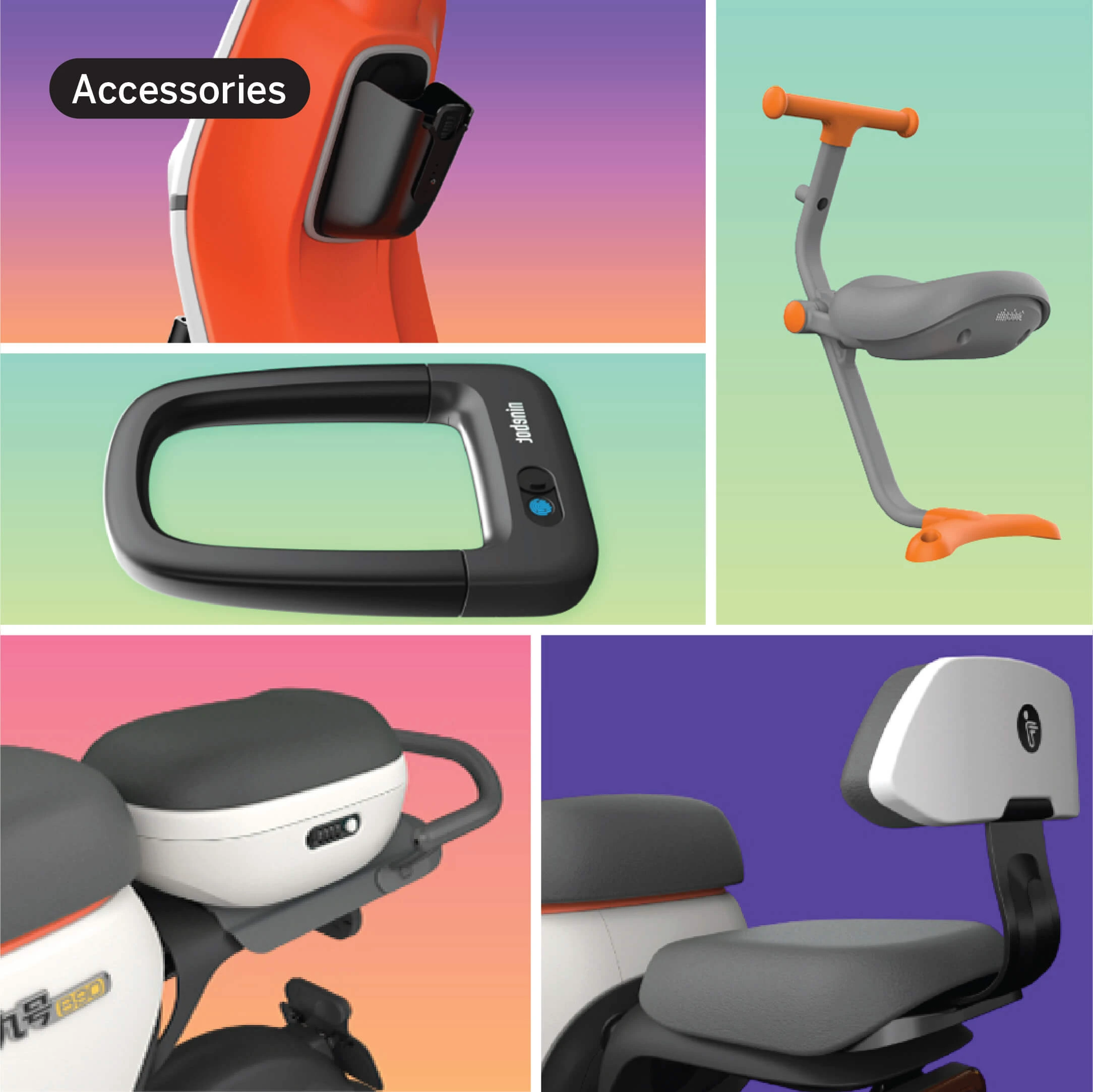 Ninebot eMoped B65 มาพร้อมอุปกรณ์เสริมให้ผู้ขับได้เลือกใช้งานอย่างหลากหลาย ตรงตามความต้องการในชีวิตประจำวัน ปรับเปลี่ยนได้ตามสถานการณ์ เช่น เบาะเสริมคนนั่ง กระเป๋าใส่ของ โซ่ล็อก และอื่นๆอีกมากมาย เตรียมพบกับอุปกรณ์เสริมแบบครบถ้วนเร็วๆนี้