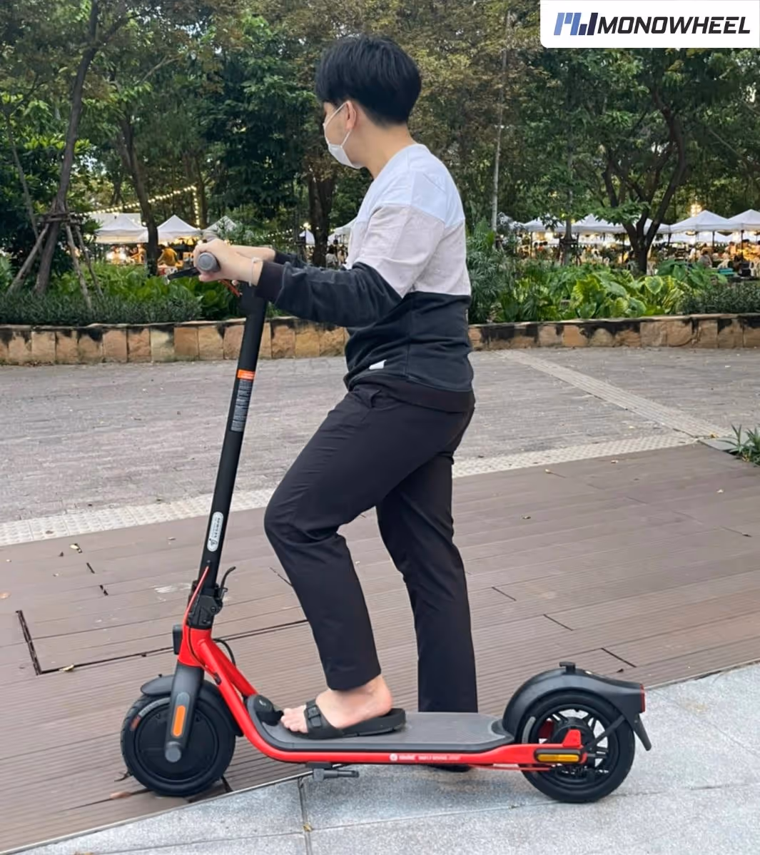 เล่าถึงฟีลการขับ ฟีลขับเผิน ๆ จะคล้ายกับ F Series แต่ถ้าขับไปมาก ๆ จะสัมผัสได้ว่าแน่นกว่า ด้วยความที่ล้อมันมีการพัฒนามาให้แข็งแรงและยืดหยุ่นขึ้นเลยทำให้เห็นผลตรงนี้ได้ และในส่วนของขับทางขรุขระความนุ่มของล้อซับแรงกระแทกได้ดีเลยไม่หัวโยก ส่วนขับลุยน้ำขัง ตัวบังโคลนยังทำหน้าที่ได้ดีเยี่ยม อีกส่วนที่น่าสนใจคือในคู่มือจากที่ทาง Segway-Ninebot D38U ขึ้นทางชันได้ประมาณ 20% แต่จากที่ลอง Test ดู สามารถขึ้นทางที่ชันที่คู่มือบอกได้ แต่ ECO จะลำบากหน่อยถ้าไม่มีแรงส่ง ส่วน Standard และ Sport ถ้ามีแรงส่ง ขึ้นทางที่ชันกว่าเดิมได้เยอะเลย