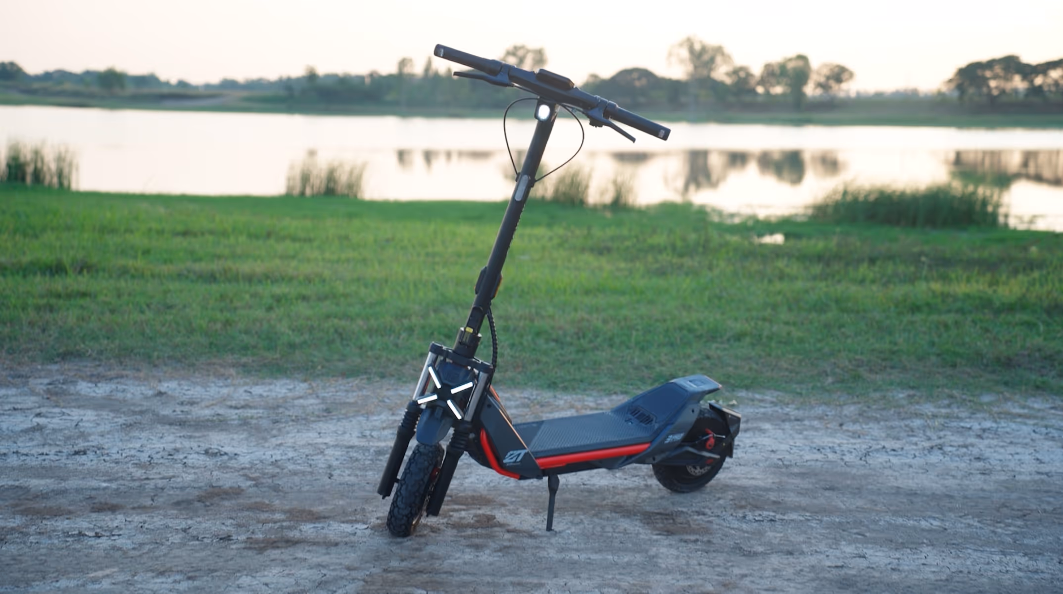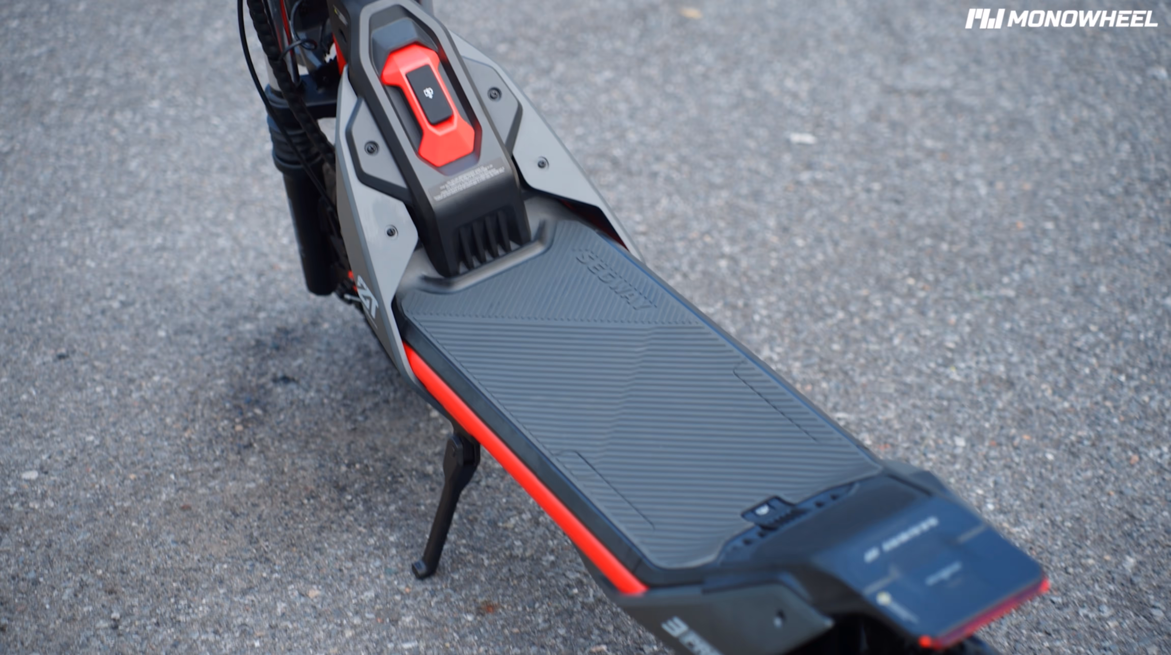 พื้นเหยียบรุ่นนี้ทำมากว้างและมีพื้นที่เหยียบแบบสบายมากเลยนะครับรุ่นนี้มีระยะฐานล้ออยู่ที่ XX ยาวกว่ารุ่นอื่น ๆ และด้านหลังดีไซน์ให้สามารถใช้เป็นพักเท้าหลังได้ด้วยนะครับ ส่วนจุดชาร์จยังอยู่ด้านหน้า และอย่างที่บอกว่าในรุ่นนี้ทำระยะยุบของโช้คไว้สูงนะครับ ทำให้ Ground Clearance ต้อสูงตามนะครับเพราะต้องเผื่อไว้ให้ระยะยุบ รุ่นนี้มี Ground Clearance อยู่ที่ XX เวลาลองยืน ลองขับ ในครั้งแรก ๆ เราจะรู้สึกว่าตัวเราลอยอยู่เหนือพื้นแบบค่อนข้างมาก บางครั้งอาจจะยังไม่ชิน แต่บอกเลยว่าลองได้ไม่นานก็สามารถปรับตัวได้แล้วนะครับ เอกลักษณืที่รุ่นนี้ทำออกมาคือ เร็ว แรง แต่ขับง่ายอย่างแน่นอนครับ