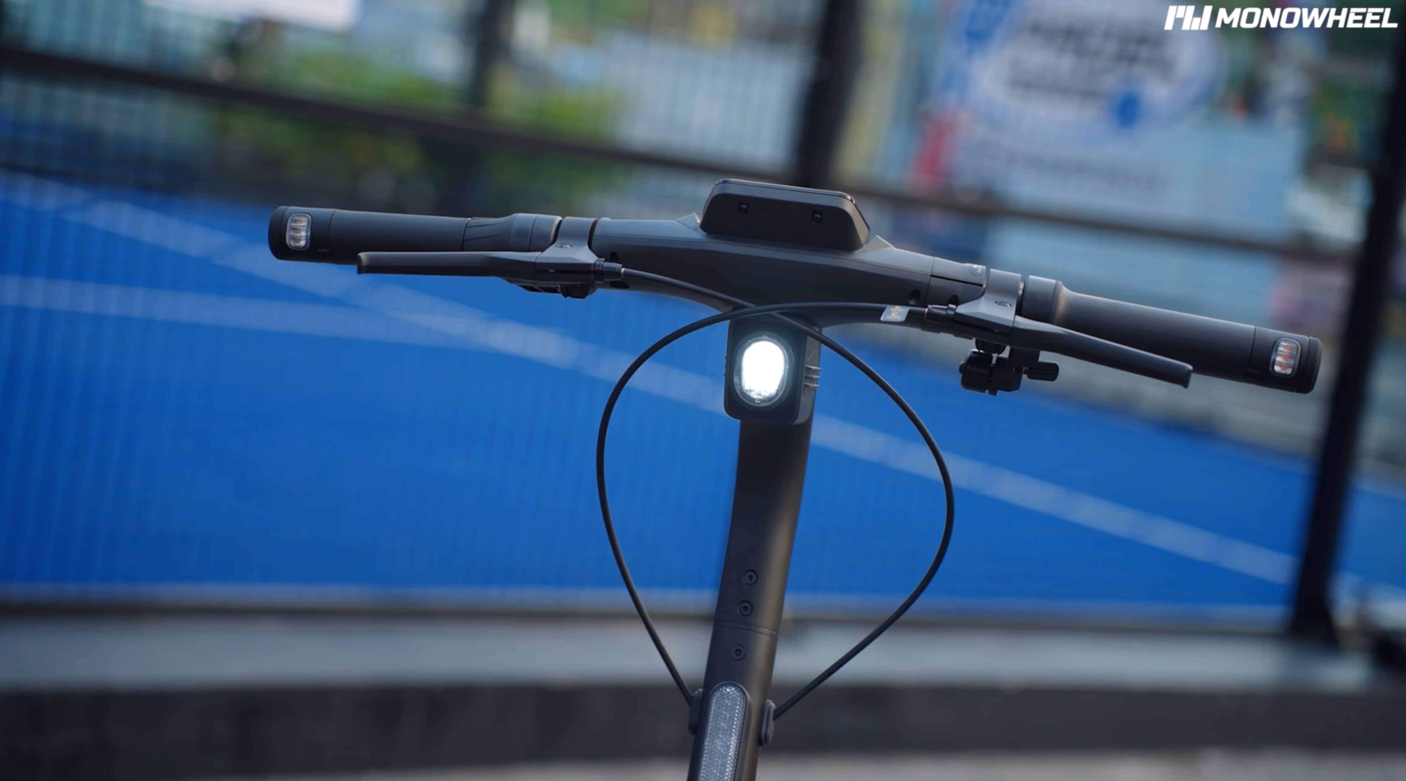 เข้ามาซูมดูใกล้ ๆ ทีละจุดตั้งแต่ Handlebar ในรุ่นนี้ดีไซน์ให้แฮนด์มีความโค้งกว่ารุ่นอื่น เพื่อให้รับกับมือและองศาการจับของเรามายิ่งขึ้น และตรงกลางเป็นหน้าจอขนาด 3 นิ้ว ที่เคลมว่าสว่างกว่ารุ่นอื่น 6 เท่า พร้อมสู้แสงแดดประเทศไทย สว่างแค่ไหนก็ยังมองเห็นได้ดีเมื่อขับขี่ในช่วงกลางวัน และมีเบรกมือทั้ง 2 ฝั่ง