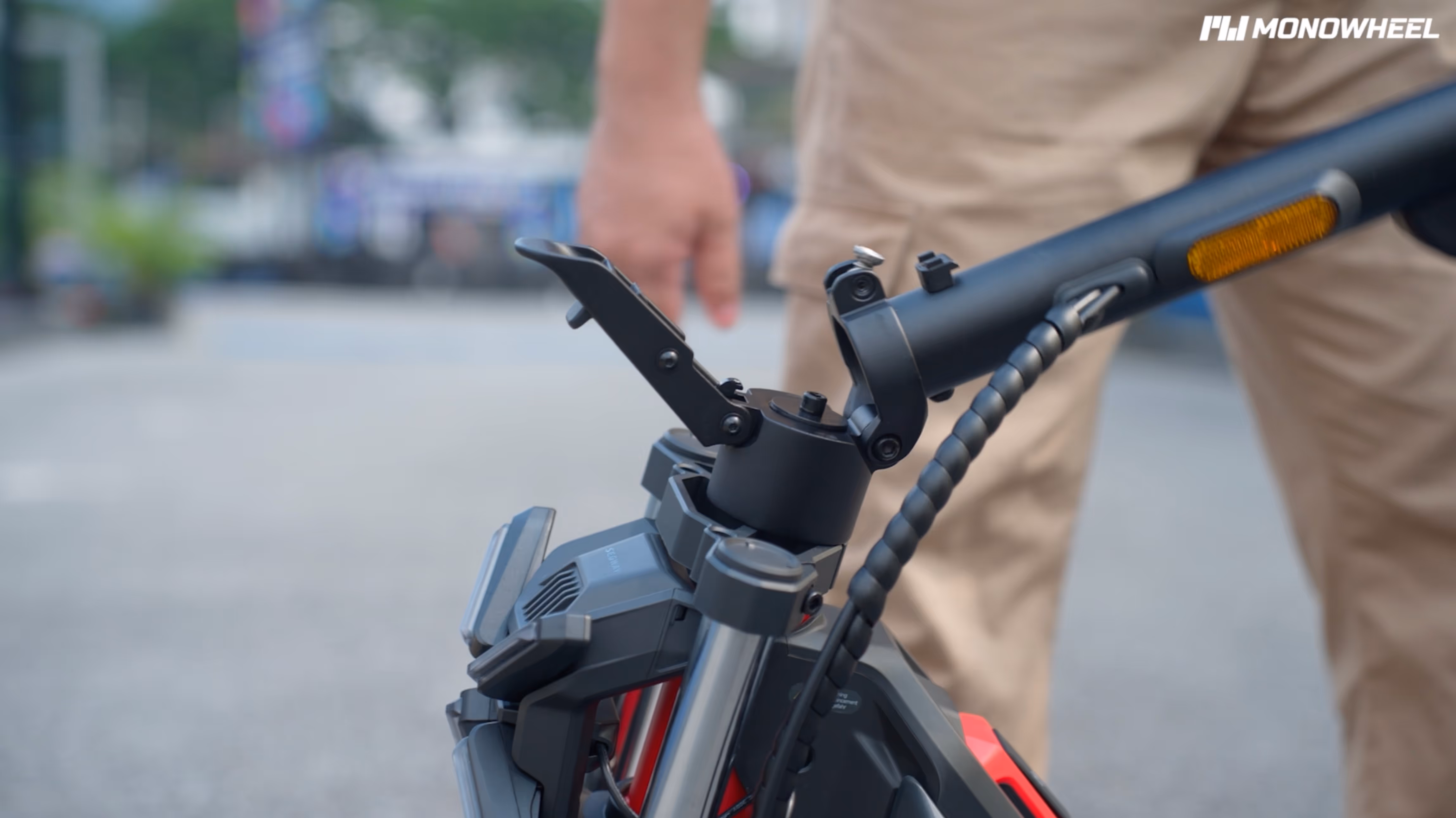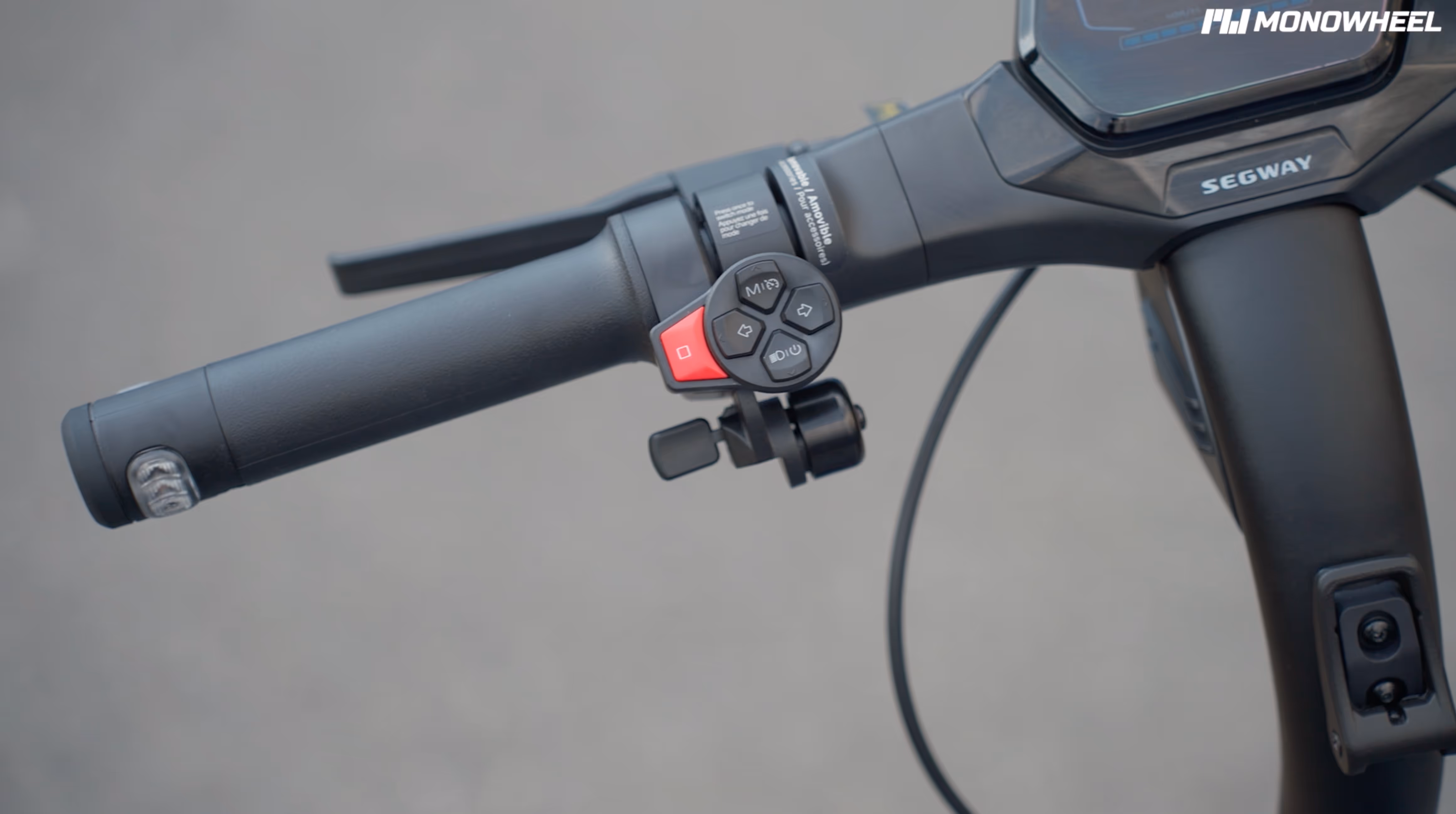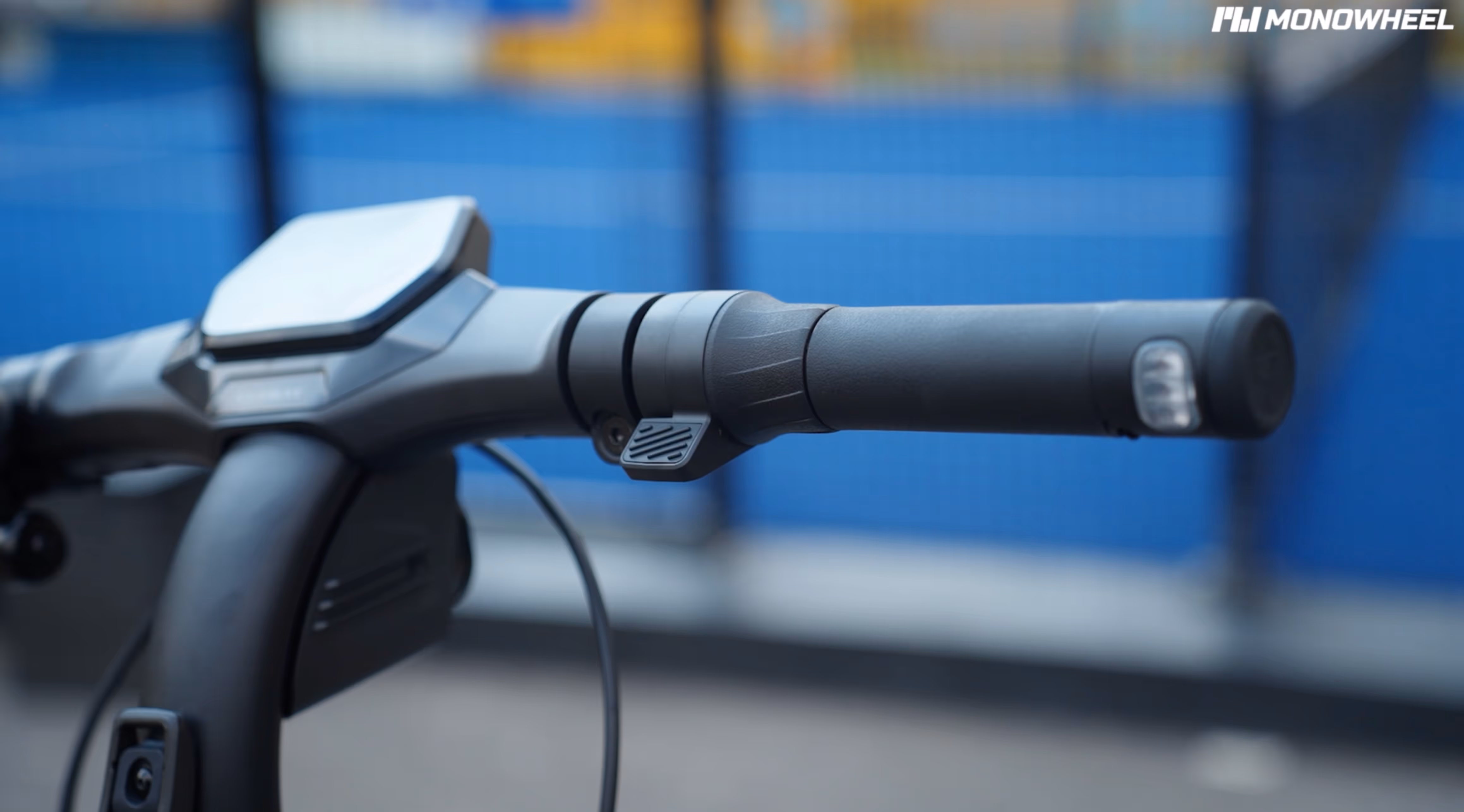 ถัดมาที่ด้านขวาเป็นคันเร่งนะครับ แค่คันเร่งก็มีเรื่องเล่าแล้ว คันเร่งรุ่นนี้เป็น Hybrid ออกแบบมาให้กดก็ได้ หรือบิดก็ได้ เป็นรุ่นแรกของ Segway-Ninebot ที่ทำแบบนี้ออกมานะครับ เพราะแต่ละคนถนัดใช้งานไม่เหมือนกัน จึงทำให้ใช้งานได้ทั้ง 2 แบบไปเลย และเนื่องจากรุ่นนี้ออกแบบมาให้มีสรรถนะที่สูงและขับขี่บนทางออฟโรดด้วย การใช้คันเร่งแบบบิดเลยดูเหมาะสมกว่าเพราะถ้าใช้คันเร่งแบบกด แล้วถ้าขับกระแทกหลุมบ่อย ๆ อาจจะทำให้เผลอไปกดคันเร่งให้ลึกกว่าเดิมและทำให้เครื่องพุ่งได้ เพราะฉะนั้นการใช้งานในเมืองก็ใช้แบบกด จะได้ไม่เมื่อยมือมาก แต่ถ้าต้องลุยออฟโรด ก็ใช้แบบบิดจะเหมาะกว่านั่นเอง