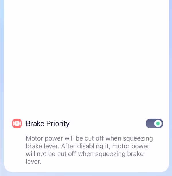 ฟังก์ชั่นตอบโจทย์สายแรง เป็นฟังก์ชั่นที่เราตั้งค่าได้ว่าเมื่อเรากำเบรกจะให้เซนเซอร์ของมอเตอร์ทำงานมั้ย หากกดเปิด มอเตอร์จะไม่ทำงาน แต่หากเราปิดไว้ต่อให้เรากำเบรก แต่ถ้าเรายังกดคันเร่งอยู่ มอเตอร์ก็จะยังเร่งอยู่ เหมาะกับในบางสถานการณ์เช่นการเข้าโค้ง ที่ทำให้เราเบรกแต่ยังเลี้ยงคันเร่งไว้ได้นั่นเอง
