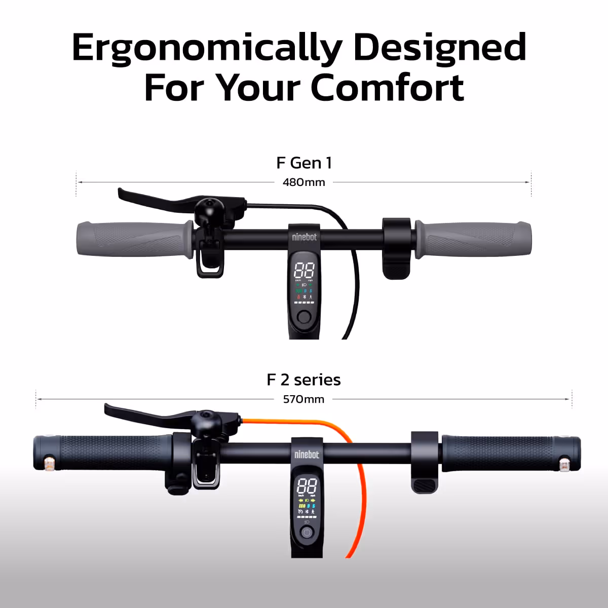 Ninebot F2 Series ได้รับการออกแบบให้มีแฮนด์จับที่มีขนาดกว้างขึ้นเพื่อให้การจับการควบคุมเป็นไปได้ง่ายและสบายกว่าเดิมรวมถึงเป็นการเพิ่มพื้นที่สำหรับติดตั้งอุปกรณ์เสริมได้มากขึ้น