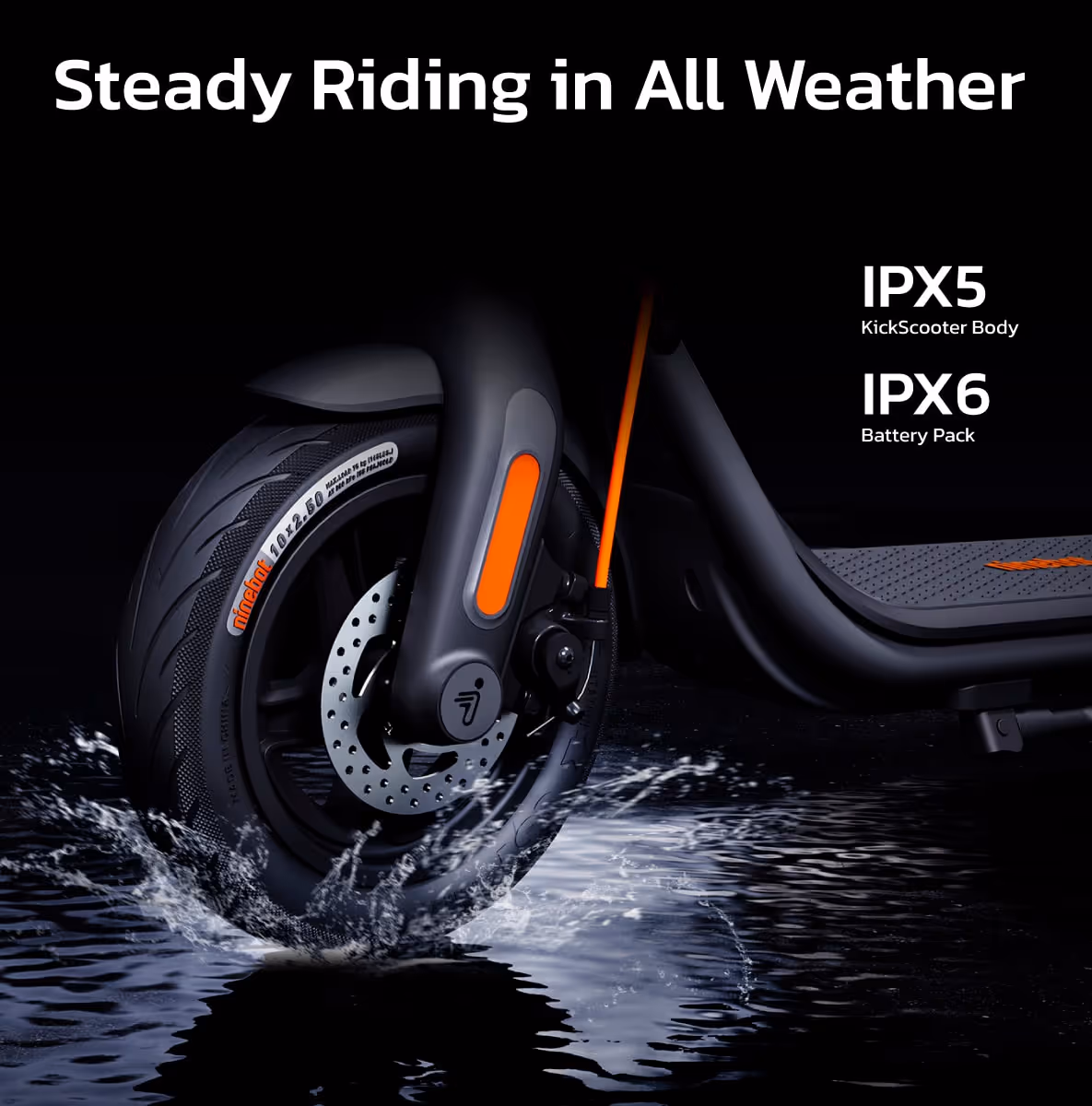ด้วยโครงสร้างที่ทำมาจากเหล็กคุณภาพ มีความแข็งแรงสูงทำให้ Ninebot F2 Series สามารถใช้งานได้อย่างเต็มที่พร้อมรับความท้าทายที่สมบุกสมบันกับตัวเครื่องมาตรฐานกันน้ำ ที่ IPX5 และแบตเตอรี่มีมาตรฐานกันน้ำอยู่ที่ IPX6