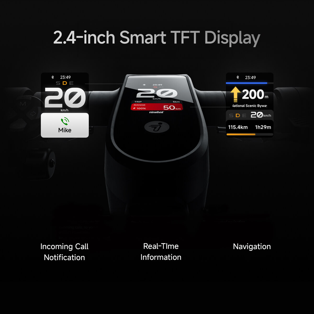 Ninebot MAX G3 มาพร้อม หน้าจอสี Smart TFT ขนาด 2.4 นิ้ว ที่สามารถแสดงข้อมูลการใช้งานแบบ เรียลไทม์ ด้วยอินเทอร์เฟซที่คมชัดและอ่านง่าย หน้าจอนี้ยังมีฟังก์ชันนำทางในตัว ให้คุณสามารถดูแผนที่ขณะขับขี่ได้อย่างสะดวก อีกทั้งยังสามารถ แจ้งเตือนสายเรียกเข้า พร้อมแสดงชื่อหรือหมายเลขโทรศัพท์ รวมถึงแสดงเวลาประมาณการที่แบตเตอรี่จะชาร์จเต็ม และการแจ้งเตือนอื่น ๆ เพื่อให้คุณควบคุมทุกการเดินทางได้อย่างมีประสิทธิภาพ